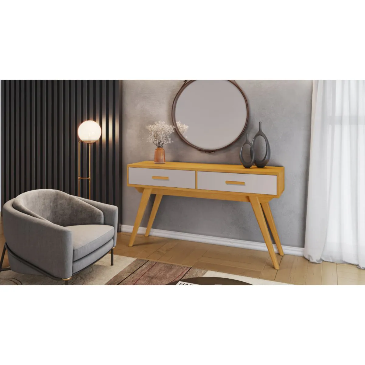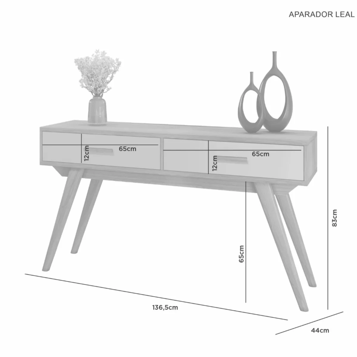 O aparador Leal é uma peça de mobiliário que combina modernidade e elegância de forma equilibrada. Com suas medidas de 136,5 cm de largura, 83 cm de altura e uma profundidade ampla de 44 cm, destaca-se por sua versatilidade em se integrar a diferentes ambientes. Os pés e puxadores em madeira maciça adicionam um toque de sofisticação, proporcionando uma estética clássica e atemporal. Com duas gavetas equipadas com corrediças telescópicas, o aparador oferece praticidade e suavidade no uso diário, tornando-o não apenas um elemento decorativo, mas também funcional.